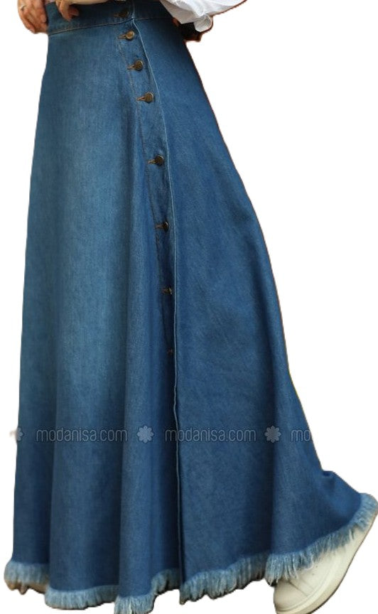 Denim long skirts are a timeless fashion staple that combines the durability of denim with the elegance of a full-length silhouette. Designed to offer both comfort and style, these skirts come in various cuts—straight, A-line, mermaid, or flared—making them versatile for casual, semi-formal, and even modest fashion looks. The sturdy denim fabric ensures long-lasting wear, while design details like front slits, button-down closures, frayed hems, or pockets add personality and charm. Perfect for year-round styling, denim long skirts pair effortlessly with t-shirts, blouses, sweaters, or jackets, allowing endless outfit possibilities. Whether in classic blue, black, white, or trendy washed finishes, they provide a chic blend of casual ease and feminine grace.