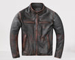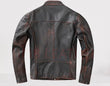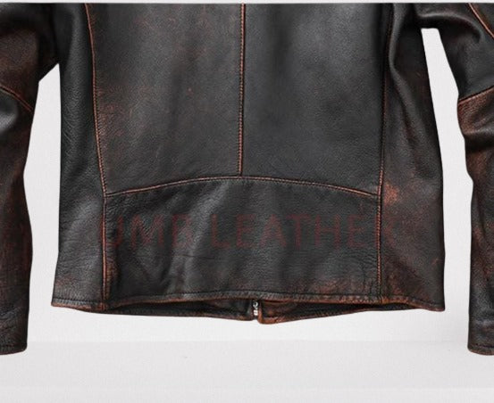 This vintage leather jacket is constructed in panels and it is handcrafted out of premium leather seasoned from sheep skin. It is provided with four smooth durable zippers and satin lining.