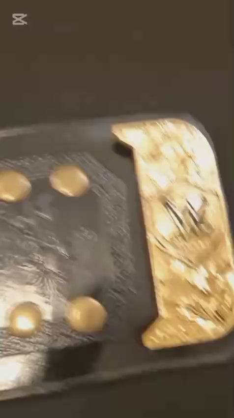 The Iconic belt features a gold plated main plate and two side plates on leather strap with gold tip at the end.